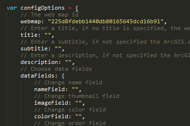Using any text editor, open the index.html file (see step 1), and scroll down toward the bottom where you'll see the configOptions. Change the following options to match your data: